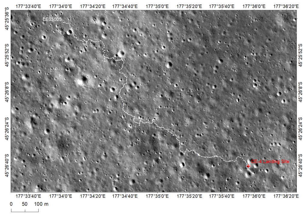 前50个月昼玉兔二号月球车月面行驶轨迹图,行驶距离累计1455.2米,距离嫦娥4号着陆器的直线距离865.1米。(国家航天局供图)