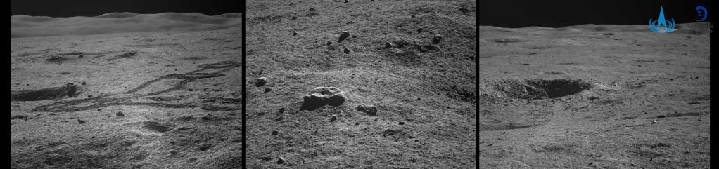 第51月昼上午期间(2023年1月18日),当玉兔二号月球车行驶至LE05103点时,全景相机拍摄的月面图像。其中,左图为月球车留下的车辙图像,中图为距离月球车约4米处的一块石头,大小约为25厘米;右图为距离月球车约37米处的一个小型撞击坑,直径约5米。(国家航天局供图)