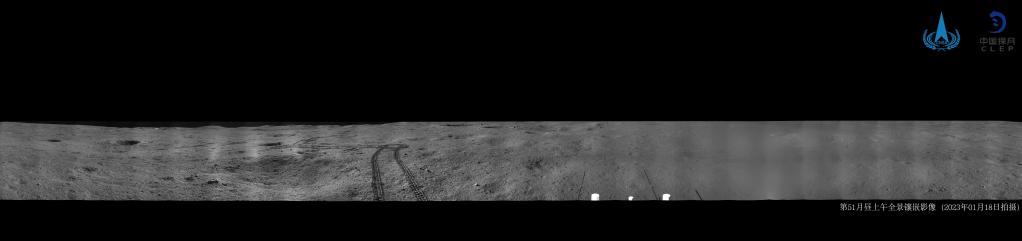 第51月昼上午期间(2023年1月18日),当玉兔二号月球车行驶至LE05103点时,搭载在月球车上的全景相机对月球车周围360度环拍,该图由全景相机环拍图拼接得到,图中可以看到月球车留下的车辙。(国家航天局供图)