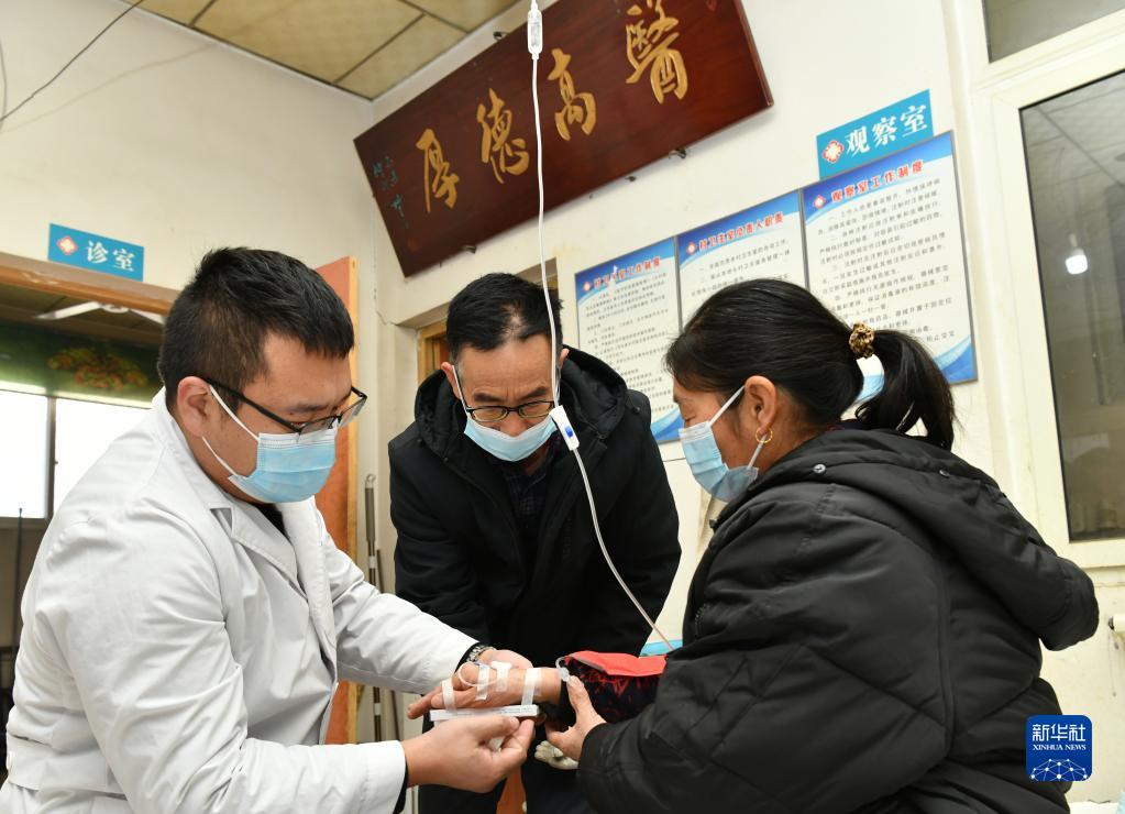 1月20日,南洋阳(左一)在村卫生室内为村民输液。