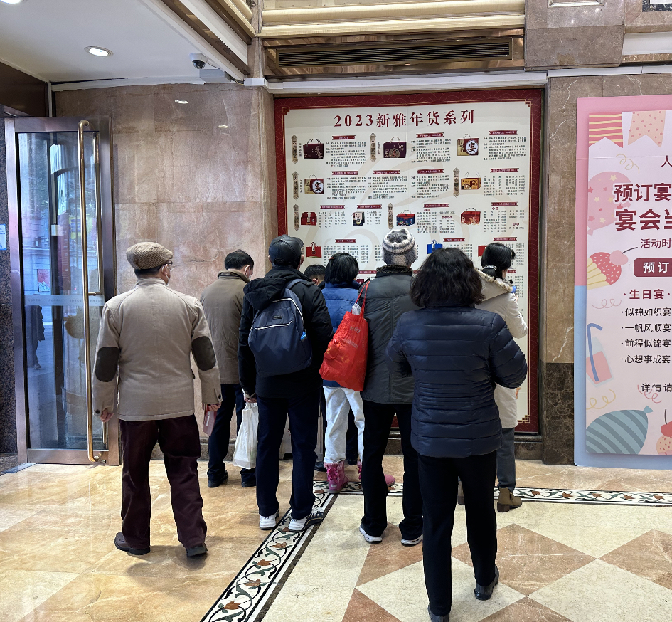 春节前,“中华商业第一街”南京路上再次排起了长队。“老字号”新雅粤菜馆将2023年年货系列的货品详情张贴在了门店内,不少居民排着队围着详情单细细研究。