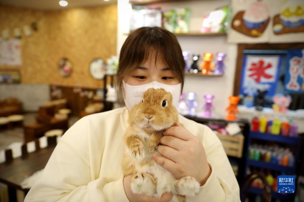 1月20日,沈阳一家兔咖宠物体验店的店员抱着一只宠物兔。
