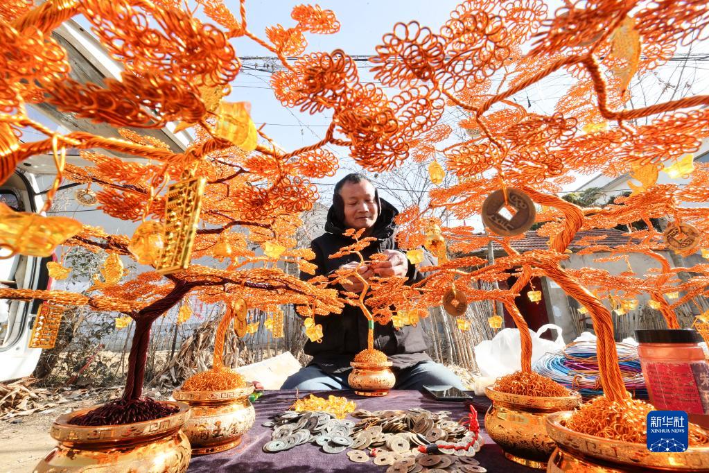 1月20日,一位民间艺人在江苏省连云港市赣榆区城头镇年集上制作“发财树”。