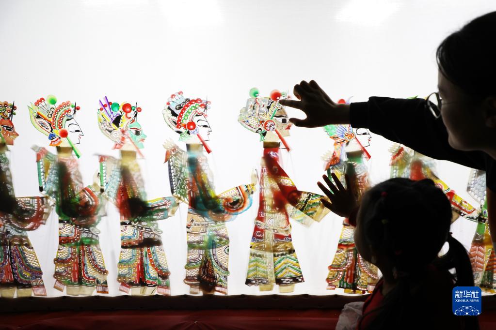 1月13日,市民带着孩子在河北省唐山市丰润区文化馆近距离感受皮影艺术。