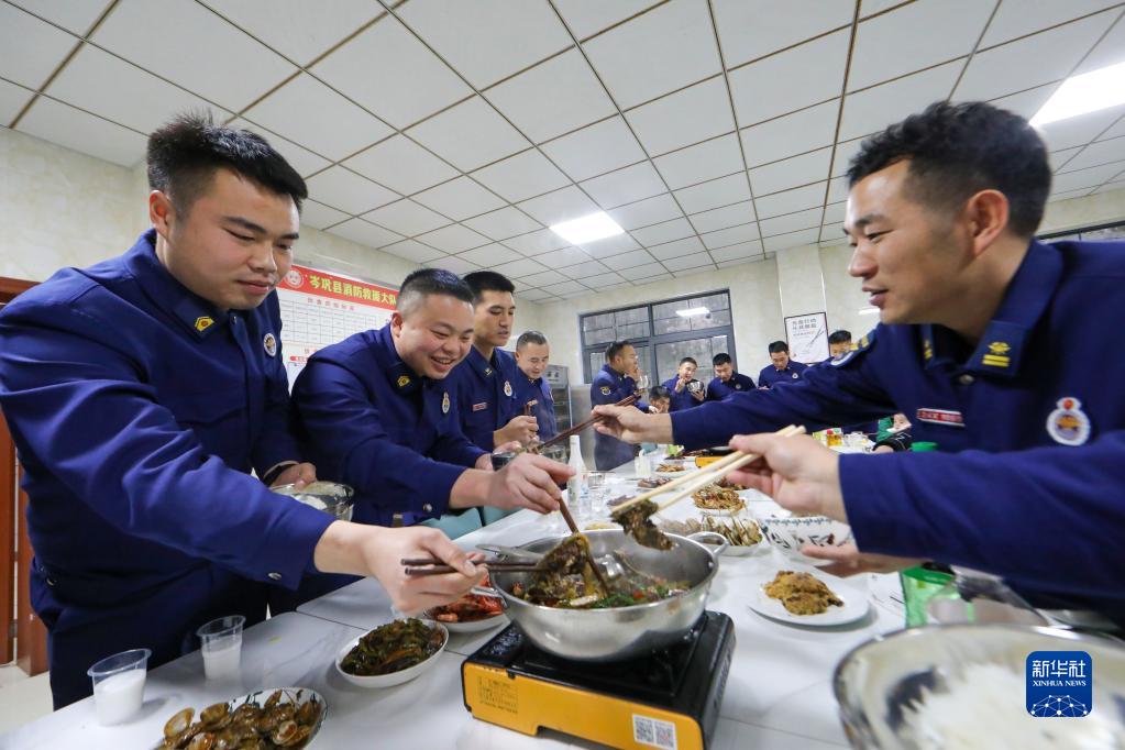 1月21日,消防员在贵州省黔东南苗族侗族自治州岑巩县消防救援大队食堂吃年夜饭。