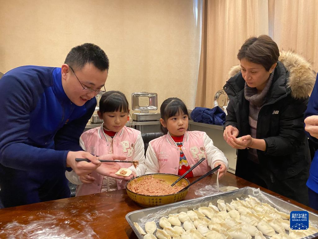 1月21日,在黑龙江漠河北极村消防救援站内,来自湖北武汉的游客与消防员一起包饺子。北极村消防救援站的消防员在执勤过程中,通过与这些游客交流得知他们要在北极村过年,便邀请他们来北极村消防站一起迎接兔年春节。