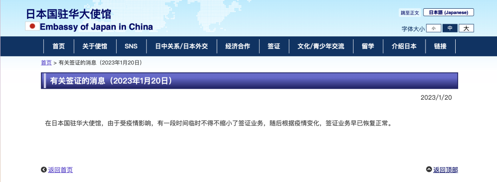据日本驻华使馆网站1月20日消息,“在日本国驻华大使馆,由于受疫情影响,有一段时间临时不得不缩小了签证业务,随后根据疫情变化,签证业务早已恢复正常。”
