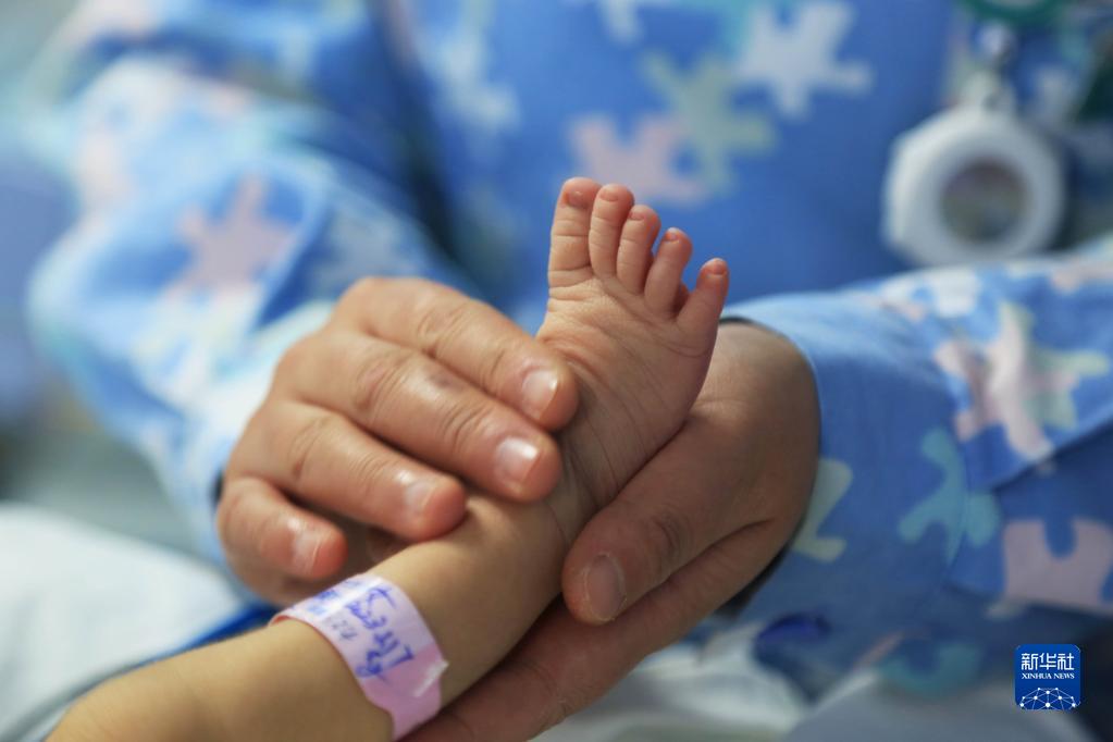 1月21日,甘肃省定西市第二人民医院新生儿重症监护室的护士在给新生儿按摩。