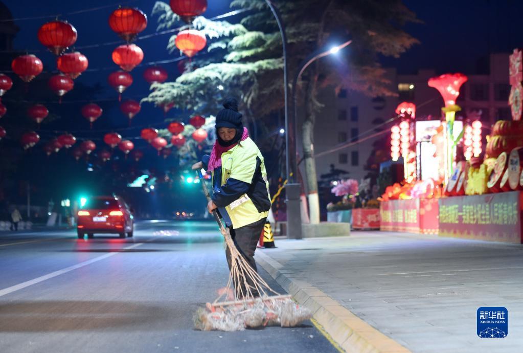 1月22日凌晨,河北省石家庄市井陉县环卫工人在清扫道路。