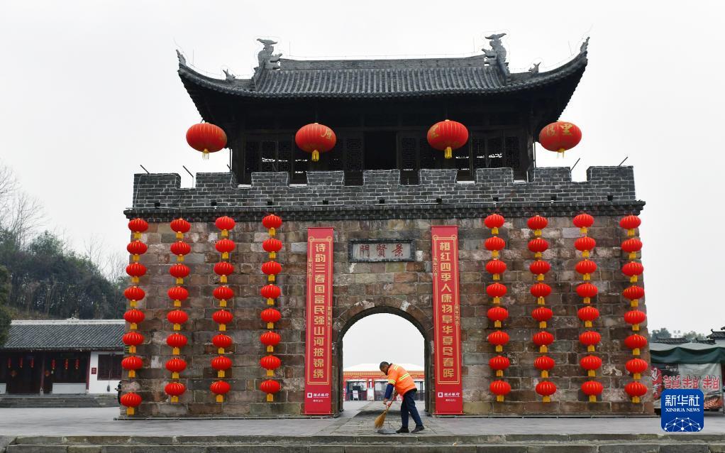 1月22日,环卫工人在湖北省宜昌市秭归县屈原故里景区南门广场清扫保洁。