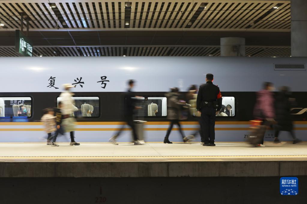 1月21日,在西安北站,铁路民警坚守岗位,护送旅客平安出行。