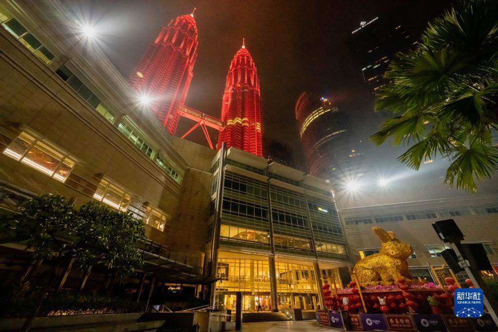 1月22日零时许,位于吉隆坡的马来西亚国家石油公司双塔点亮红色灯光,庆祝农历新年的到来。