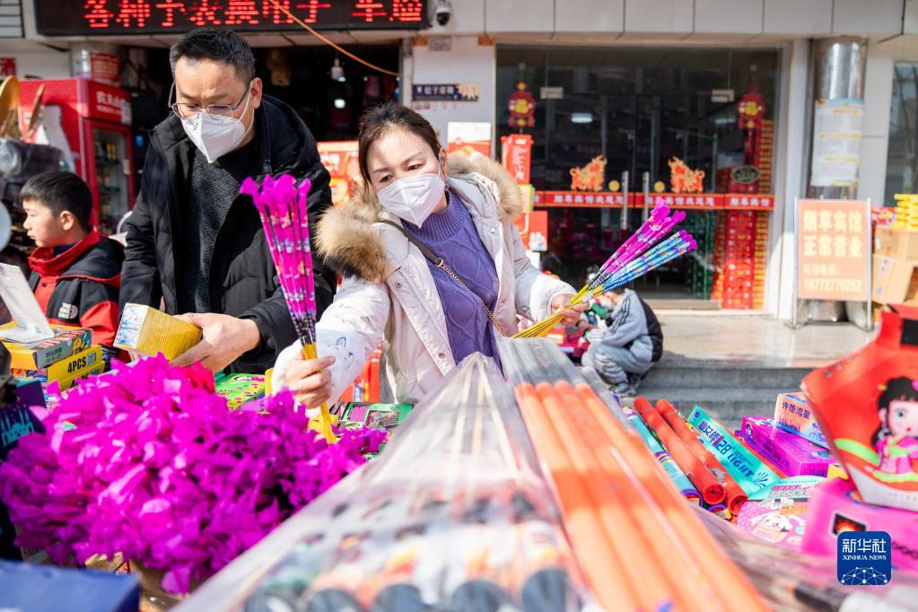 1月22日,在湖北省竹山县,两名顾客在购买鞭炮。