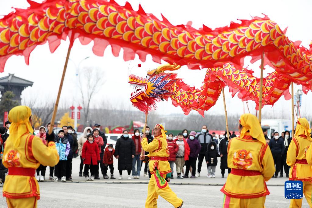 1月22日,在山东省临沂市郯城县郯国古城景区,民俗表演队伍表演舞龙。