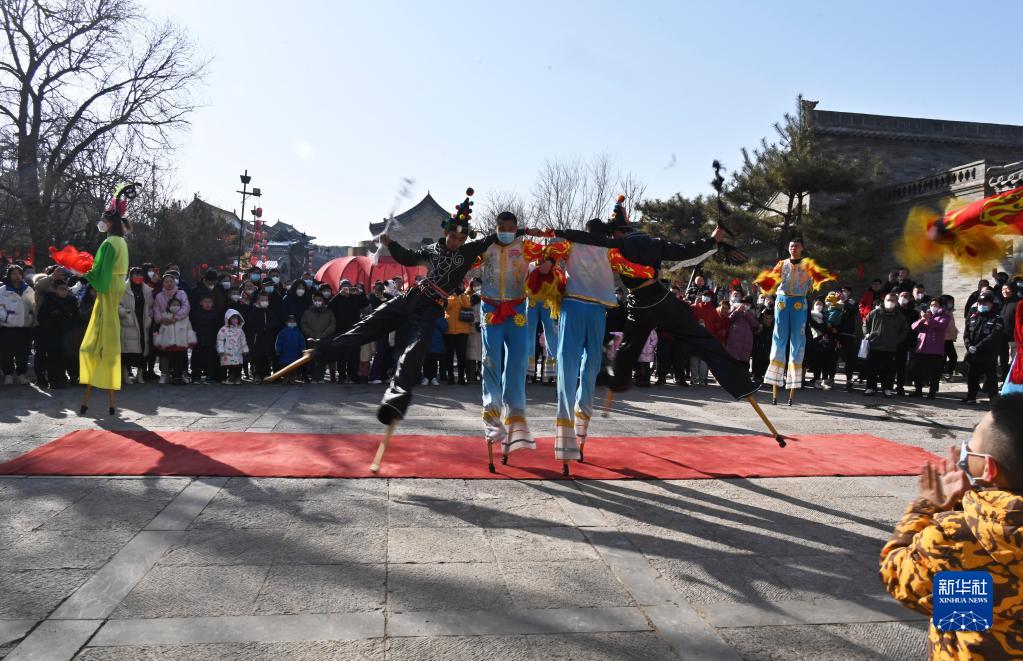 1月22日,游客在山西省阳曲县青龙古镇内观看踩高跷表演。
