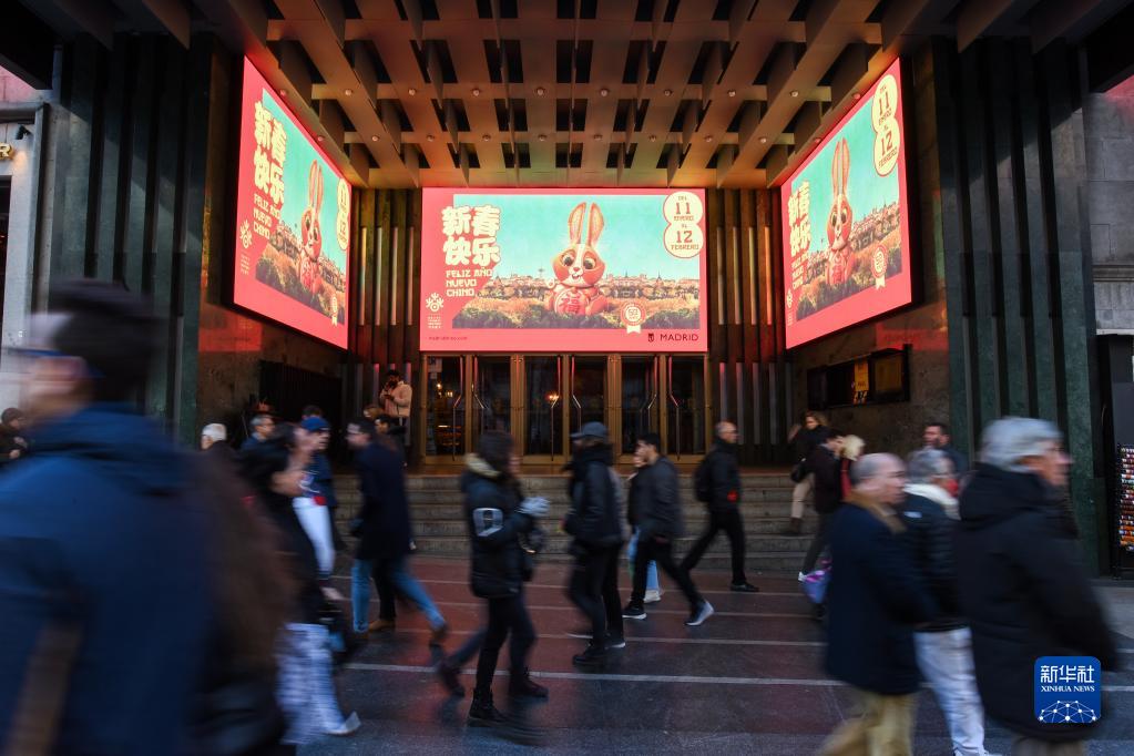 1月21日,西班牙马德里市中心格兰比亚大街上电子屏投影出的兔年春节海报。