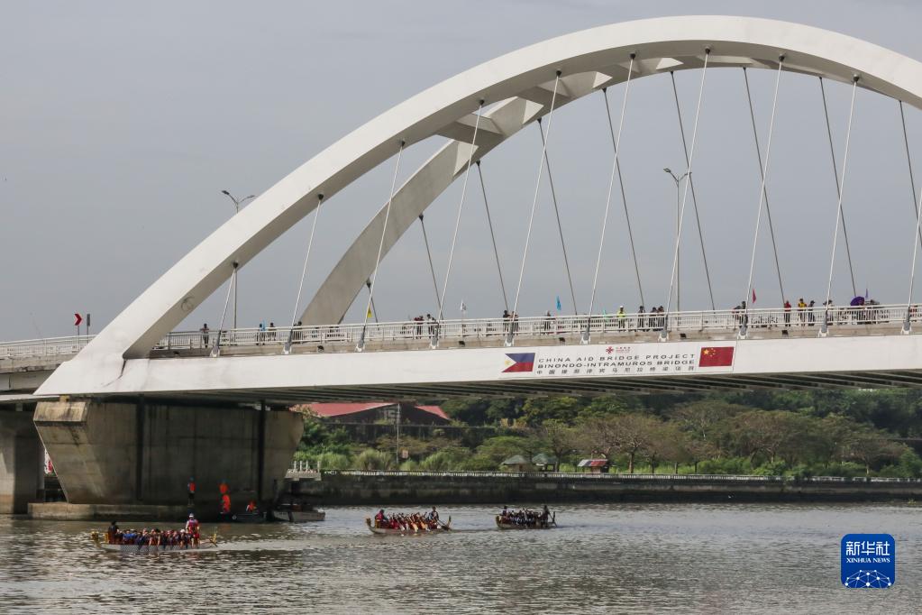 1月22日,在菲律宾马尼拉,参加龙舟赛的船只通过中国政府援建菲律宾比农多-王城跨河公路桥。