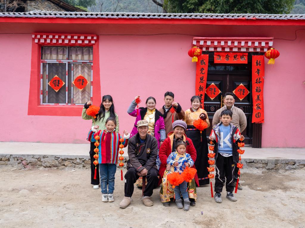 1月22日,王小军全家在新居前拍摄全家福。 (石棉县融媒体中心供图)