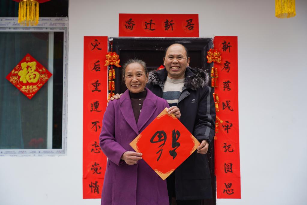 1月22日,石棉县新民藏族彝族乡农乡村二组村民刘芳蓉和丈夫在新居前合影。(石棉县融媒体中心供图)