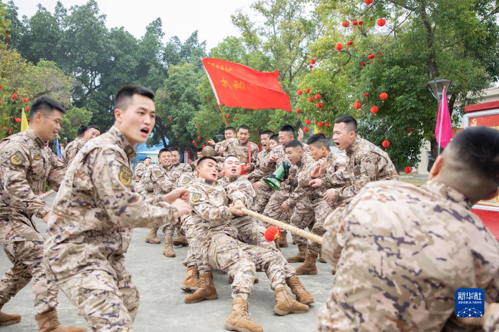 1月22日,武警广西总队北海支队为丰富节日生活组织官兵开展拔河比赛。