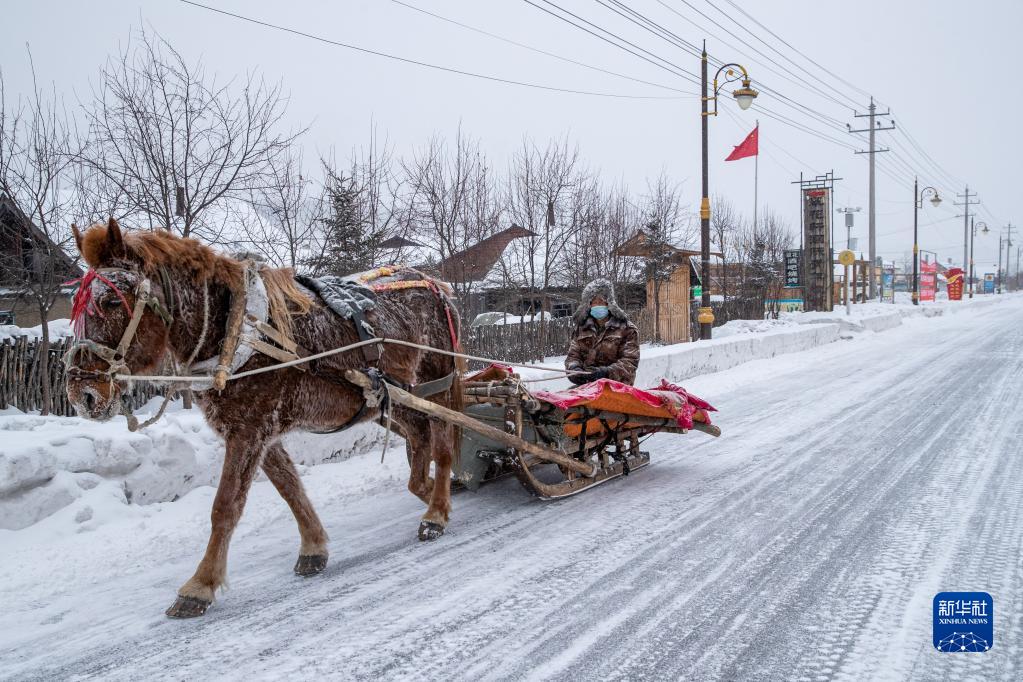 1月12日,在黑龙江省漠河市北红村内,村民前往江畔等待游客。