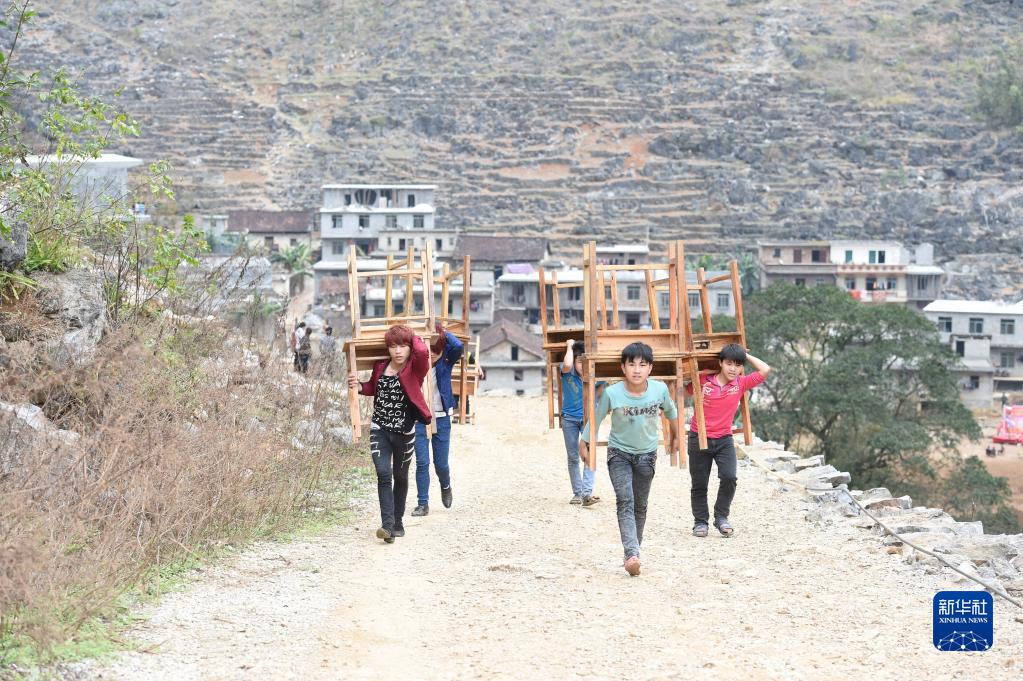 在弄顶屯首届春节晚会演出结束后,蒙宣任(右二)和伙伴们将借用的桌子送回学校(2015年2月19日摄)。