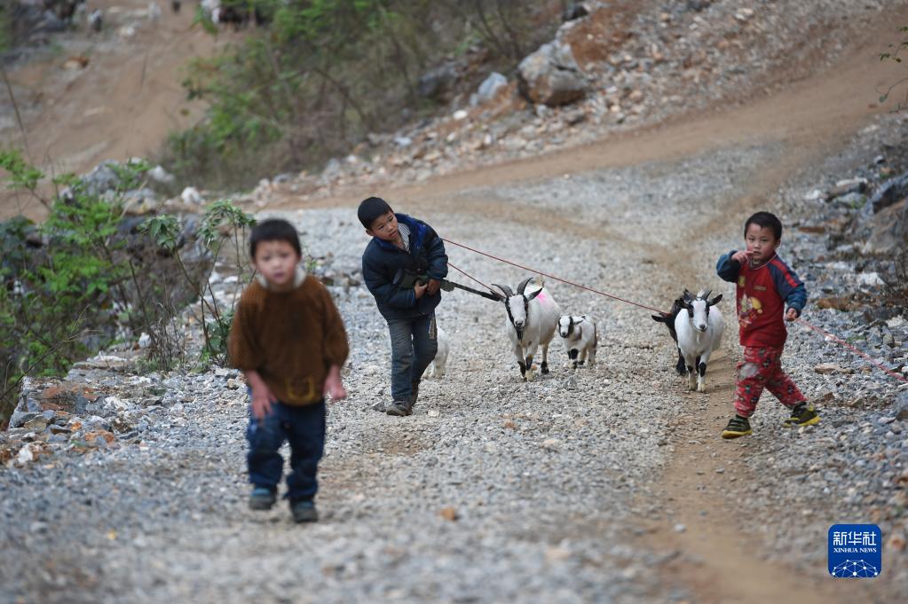 在弄勇小学读四年级的蒙宣汰(中)利用周末帮父母放羊(2015年3月7日摄)。