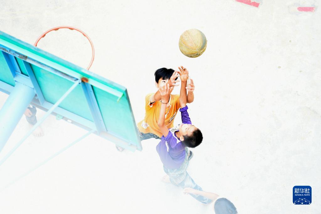 在弄勇小学读六年级的蒙宣任(左)在打篮球(2015年5月7日摄)。