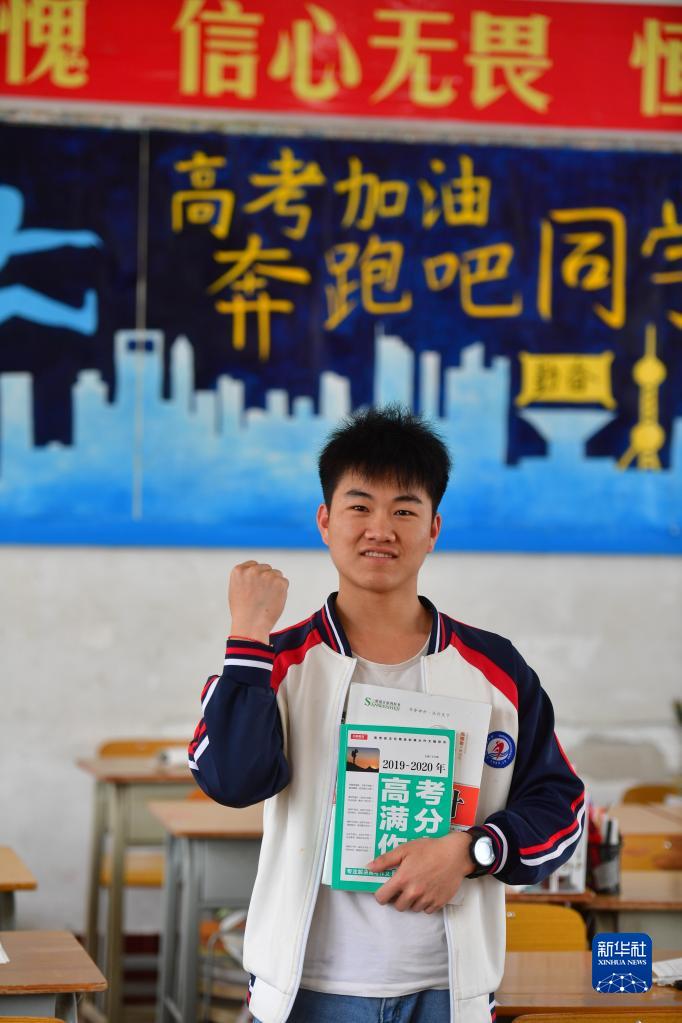 在大化瑶族自治县高级中学,高考前的蒙宣任为自己加油鼓劲(2021年3月17日摄)。
