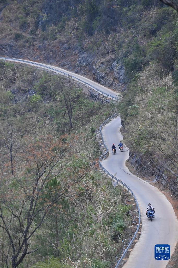 蒙宣汰(上右)和朋友骑摩托车回家(2023年1月20日摄)。曾经上学必经的山路,在2016年修通了水泥路。