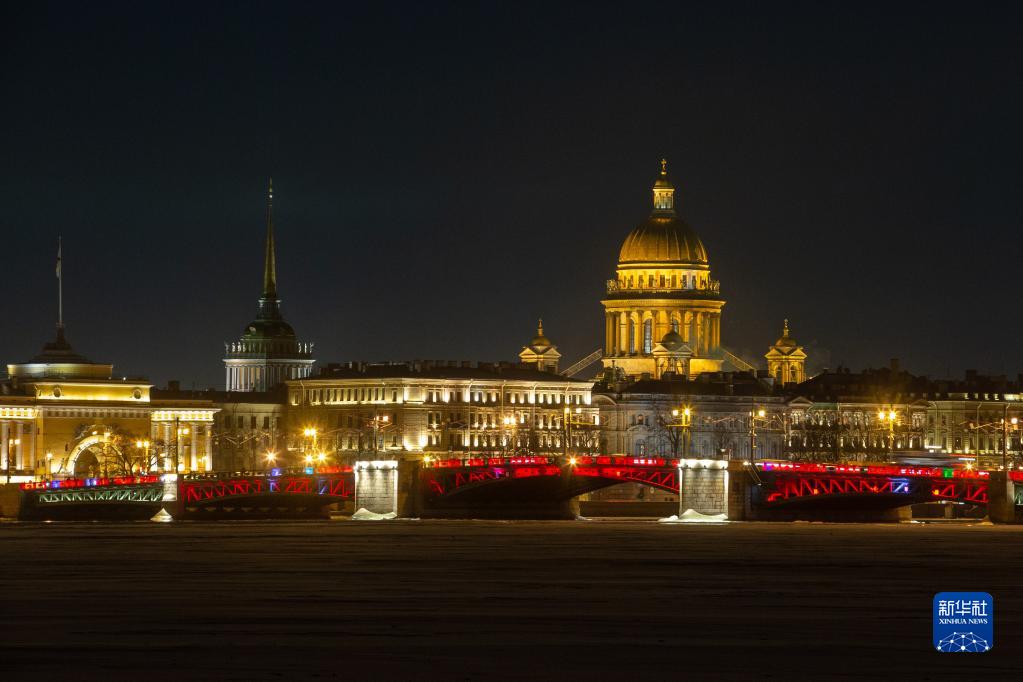 1月21日晚,俄罗斯圣彼得堡市中心涅瓦河上的地标性建筑冬宫桥亮起“中国红”,迎接兔年春节的到来。