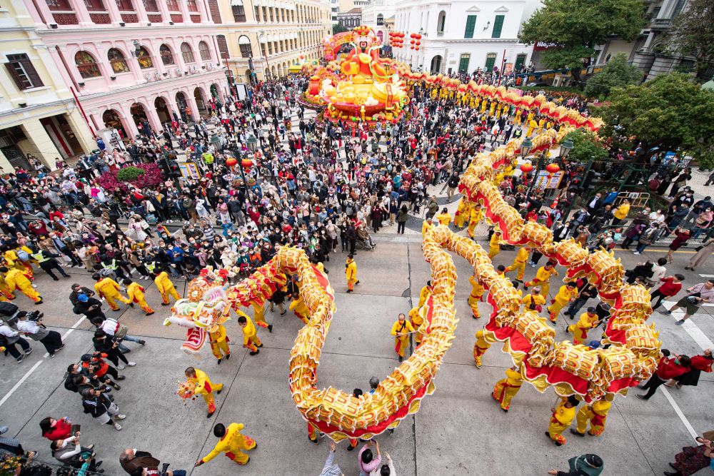 ↑1月22日,舞龙队伍在澳门议事亭前地表演。新华社记者张金加摄