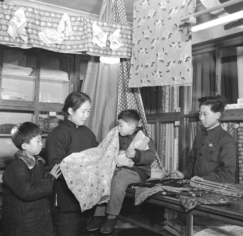 ↑1953年,天津市民杨女士带着她的两个孩子,到合作社百货部选购花布。