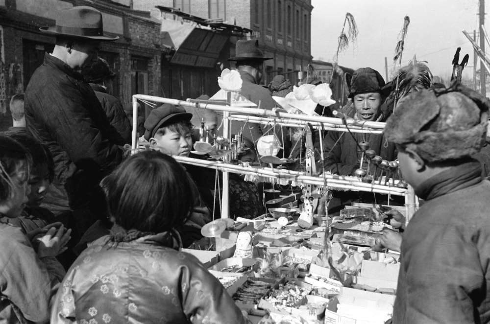 ↑1951年,河北省丰南县滦子坨村村民围着货郎摊购买年货。