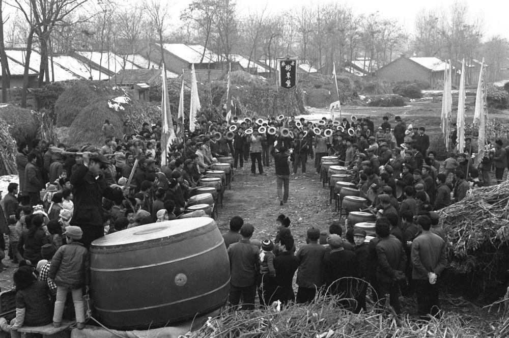 ↑1992年,陕西关中西部的眉县街东村锣鼓队擂起大鼓喜迎新春。