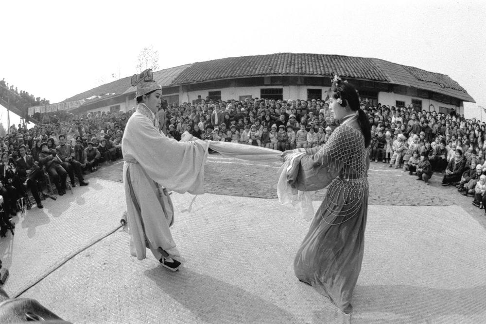 ↑1996年,四川省彭州市电力局职工在团结村庭院里演出川剧《踏伞》。