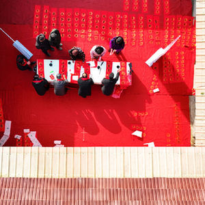 ↑1月18日,在江苏省泗洪县界集镇武岗村,书法志愿者为村民写春联(无人机照片)。新华社发(许昌亮 摄)