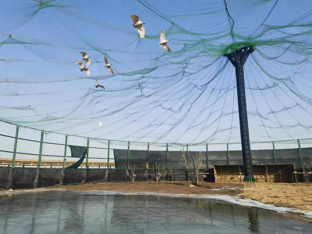 谈话间,记者随王安东来到了朱鹮的“宿舍”——面积达3300平方米、形似蒙古包的野化适应笼。见有人来,朱鹮扇动边缘略带橘红色的翅膀,在笼舍上空盘旋许久,确认安全后才驻足享用美食。