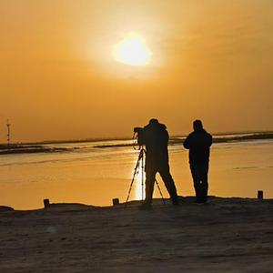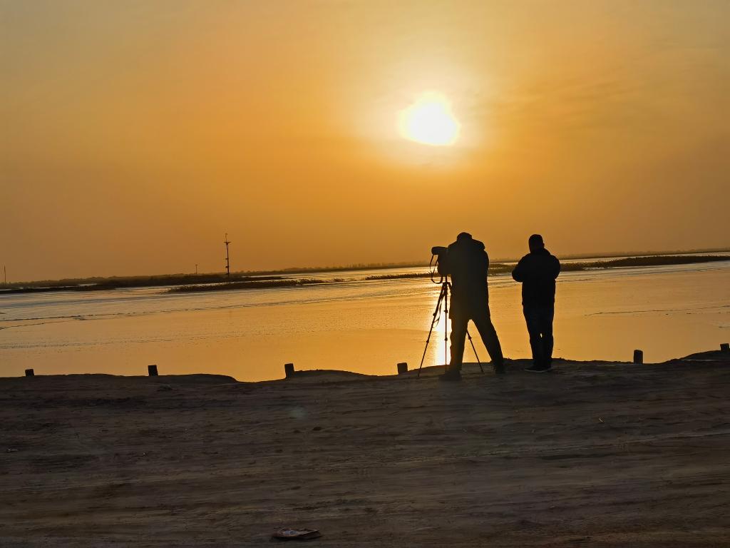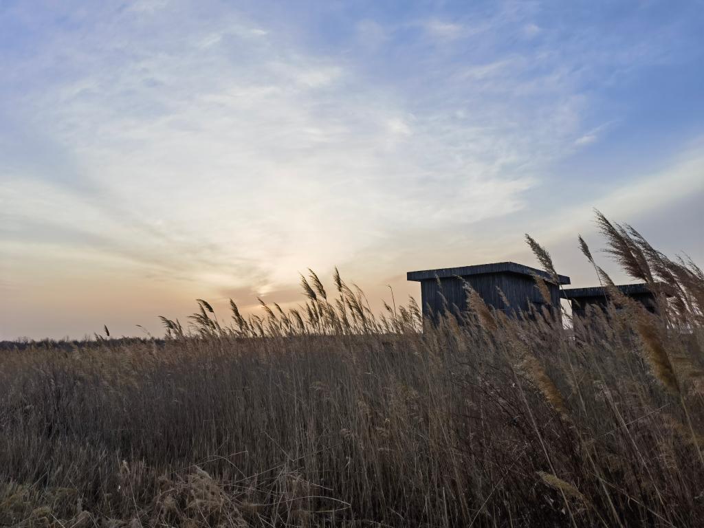 饲喂完朱鹮,一行人踏上归程。金色余晖下,芦苇一望无垠。