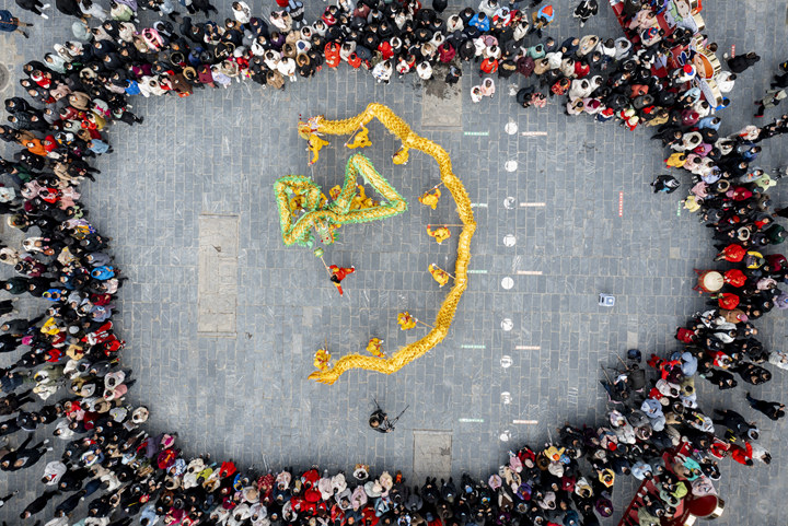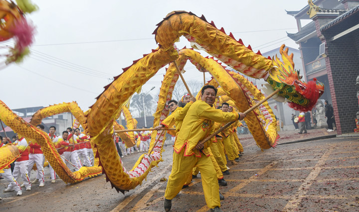 1月24日,民俗表演队伍在安徽省合肥市肥西县三河古镇的“民间文化艺术节”活动上表演舞龙。新华社发(徐勇 摄)