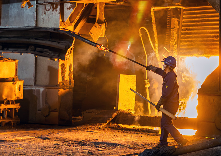 1月21日除夕,在安徽省马鞍山市的中国宝武马钢股份特钢公司生产线上,员工在进行测温取样。新华社发(罗继胜 摄)