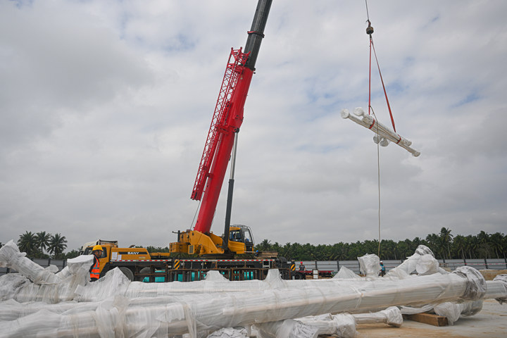 1月23日,工人在位于海南省文昌市的海南商业航天发射场1号工位转运设备构件。新华社记者 蒲晓旭 摄