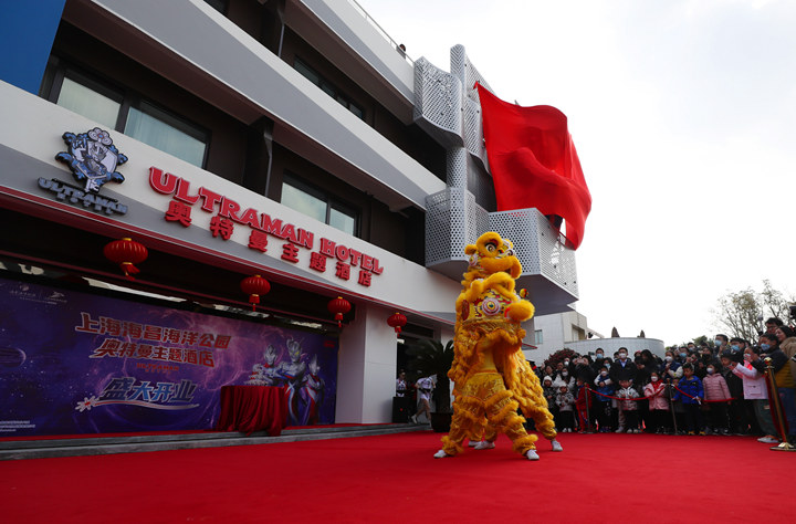 1月20日,演员在奥特曼主题酒店开业仪式现场进行舞狮表演。新华社记者 方喆 摄