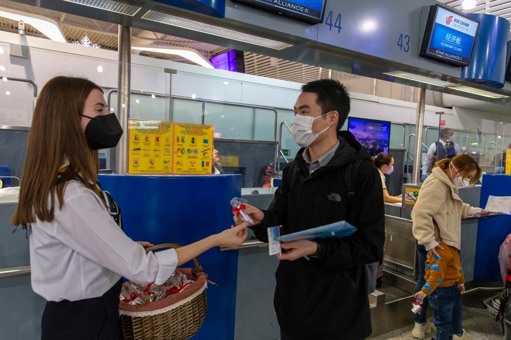 2022年12月22日,在希腊雅典国际机场,机场工作人员向旅客派送甜点礼物。新华社发(马里奥斯·罗洛斯摄)