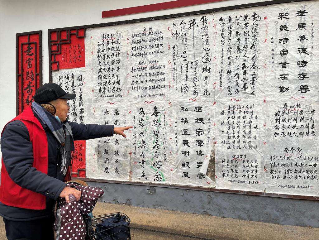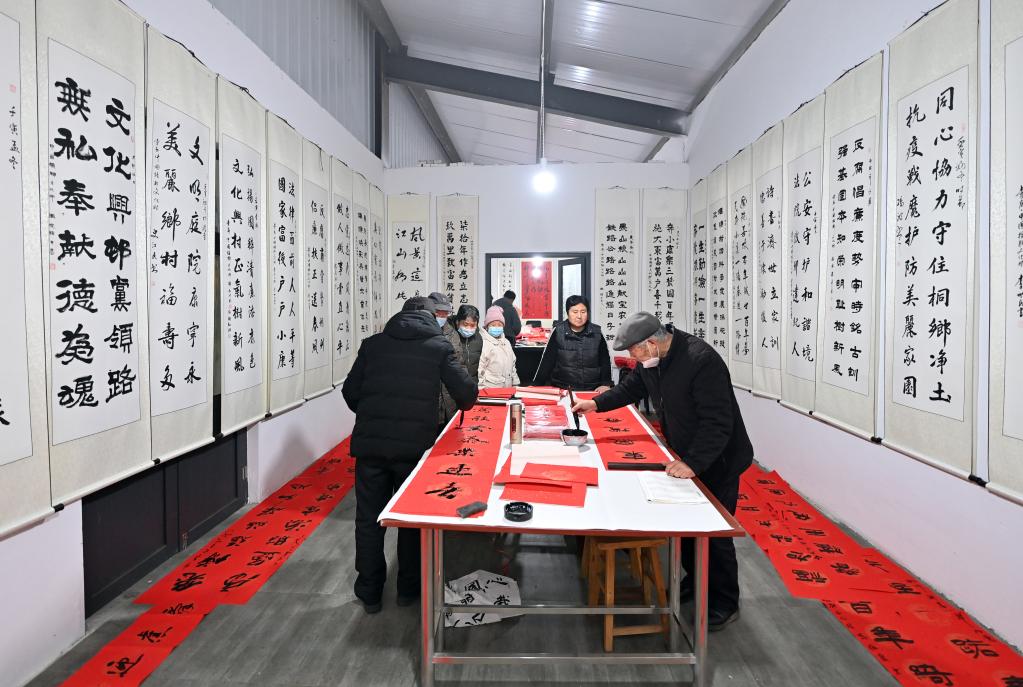 近几年,每到农历腊月二十二,由温顺等老人组成的“诗联小组”就会聚在一起,连续数日为村民书写、赠送春联。在寺底村礼堂,十多位楹联爱好者泼墨挥毫,村民们则一边欣赏一边选取自己喜欢的春联。