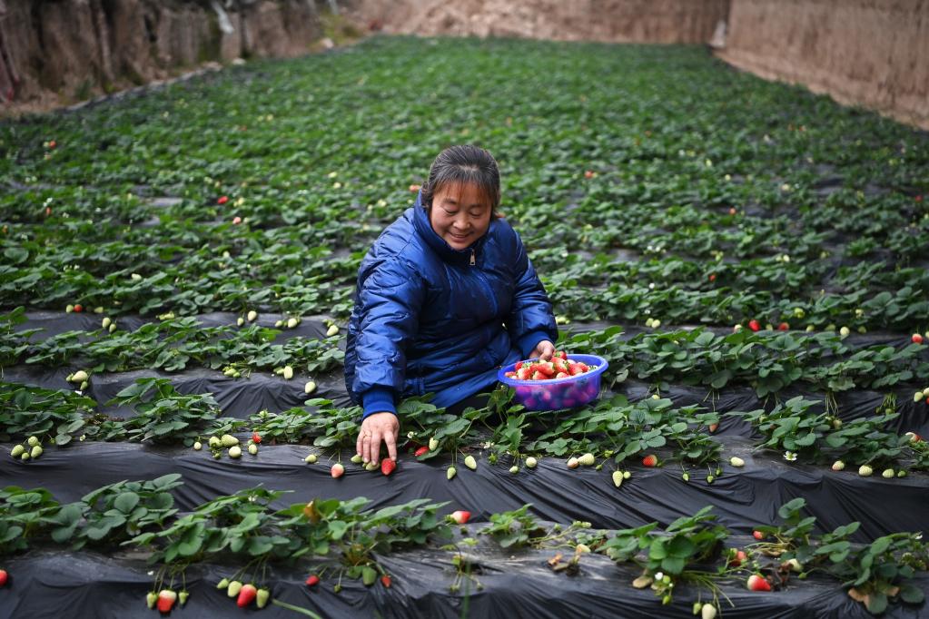 寺底村村民付引良在自家的大棚里采摘草莓。新华社记者 杨晨光 摄