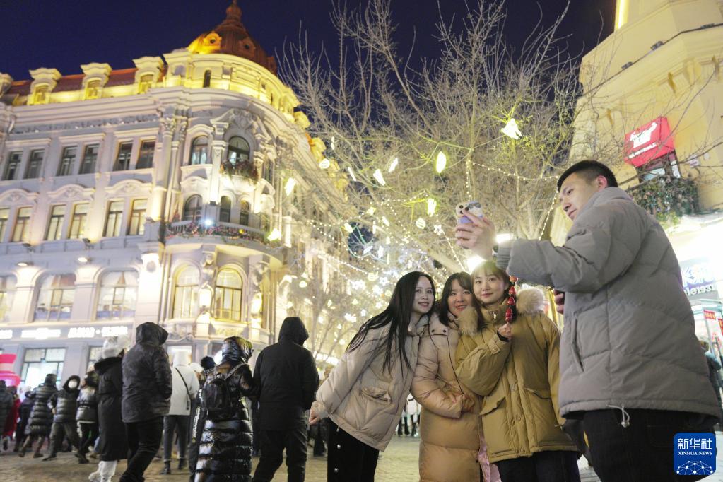 1月25日,游客在哈尔滨中央大街留影。