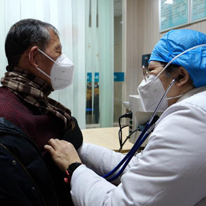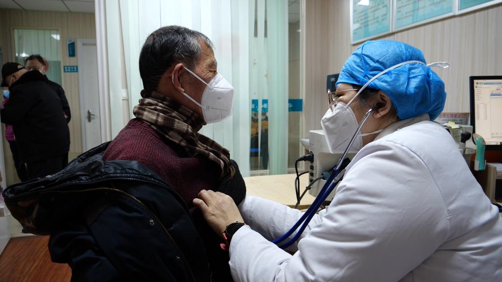 福州市台江区瀛洲社区卫生服务中心全科医生陈铭(右一)正在为患者听诊。新华社记者郭圻 摄