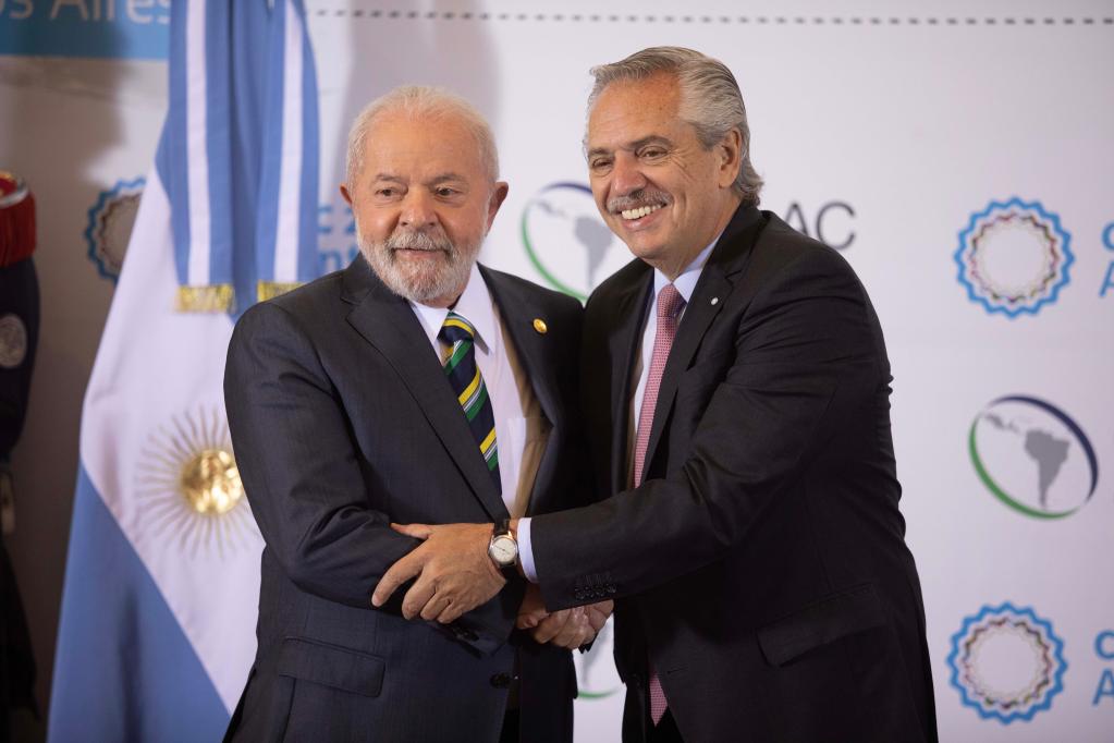 1月24日,在阿根廷布宜诺斯艾利斯举行的拉美和加勒比国家共同体第七届峰会欢迎仪式上,巴西总统卢拉(左)与阿根廷总统费尔南德斯合影。新华社发(马丁·萨巴拉摄)