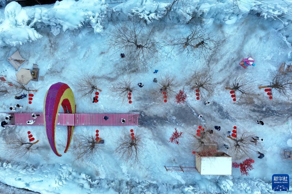 1月27日,游客在天河山景区冰雪游乐区内游览(无人机照片)。
